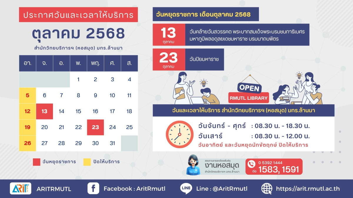 ประกาศ สวส.มทร.ล้านนา : วันหยุดราชการ เดือนตุลาคม ๒๕๖๘ (วันคล้ายวันสวรรคต พระบาทสมเด็จพระบรมชนการิเบศรมหาภูมิพลอดุลยเดชมหาราช บรมนาถบพิตร))
