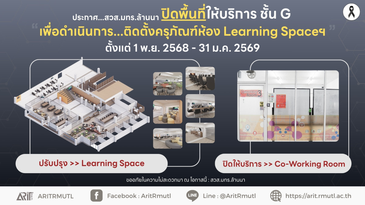 ประกาศ...สวส.มทร.ล้านนา : ปิดพื้นที่ให้บริการ ชั้น G เพื่อดำเนินการ...ติดตั้งครุภัณฑ์ห้อง Learning Spaceฯ (1 พ.ย. 68 - 31 ม.ค.69)