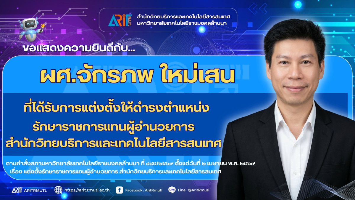 สวส.มทร.ล้านนา : ขอแสดงความยินดีกับ ผศ.จักรภพ ใหม่เสน ที่ได้รับการแต่งตั้งให้ดำรงตำแหน่ง รักษาราชการแทนผู้อำนวยการ สำนักวิทยบริการและเทคโนโลยีสารสนเทศ